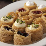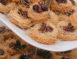 4 -توزع حبّات الكاجو والفستق فوق قطع العثملّية الدائرية والمتساوية، ويرشّ عليها قليل من القطر، وتقدّم.