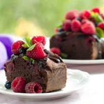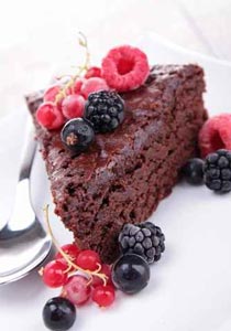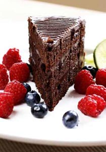 - تمرر السكين على أطراف الصينية للتأكد من تحرير الأطراف. توضع صينية التقديم بشكل مقلوب على صينية الكيك و يتم قلب الصينية لإخراج الكيك. تغطى أطراف و أعلى الكيك بالخليط المتبقى من كريمة الخفق و الشوكولاتة. توضع قطع التوت على الكيك للتزيين.