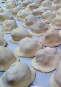 - سخني الفرن لدرجة حرارة 400 ف، افردي العجينة ثم قطعيها الى دوائر ½ 2 بوصة، ضعي قليل من الحشو في الوسط واقفلي الجوانب ثم ثبتي الطرفين مع بعضهما لتصبح بشكل طاقية.