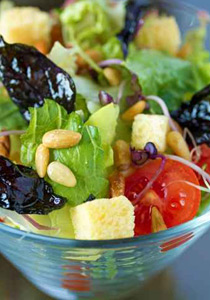 2- يحمّص الصنوبر في المقلاة، ويضاف مع الخضر إلى طبق السلطة، كما توزّع البندورة وأوراق النعناع.