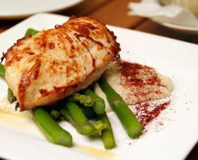 6- يقدّم الدجاج المشوي بالفرن في طبق، إلى جانب صلصة الهليون. يمكن تقديم الأرز المسلوق معه.