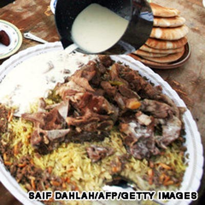 16.المنسف: هو امتياز أردني فلسطيني عبارة عن طبق كبير جدا من الرز المطبوخ مع صالصة اللبن مغطى بذبيحة الخروف الدسمة وغالبا ما تكون مأدبة كبيرة.
