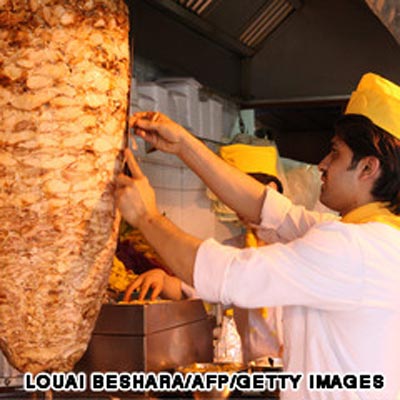 11.الشاورما: قطع رائعة من لحم الدجاج او الخروف توضع على سيخ الشوي ويضاف اليها هريس الثوم وتقدم حين تنضج مع سلطة الملفوف كساندويش في رغيف الخبز العربي مع رشة خفيفة من صالصة الطحينة والفلفل الحار على الوجه.
