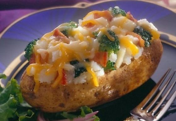 - تغسل حبات البطاطس جيدا وتنشف وتثقب بالشوكة، توضع البطاطس في صينية الشوي، ثم تشوى في الفرن بحرارة متوسطة لمدة ساعة او حتى تصبح طرية.