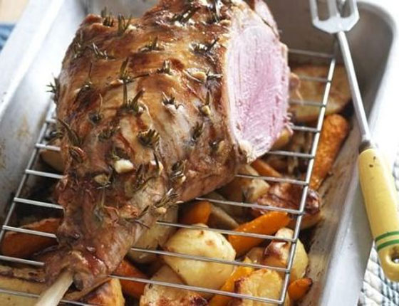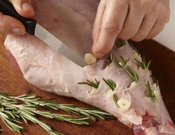 1- سخّني الفرن على حرارة 220 درجة مئوية. استخدمي سكيناً صغيراً وحاداً من الطرف لصنع فتحات في جلد الخروف، وضعي أوراق إكليل الجبل والثوم فيها. وتبّلي لحم الخروف بالملح والفلفل.
