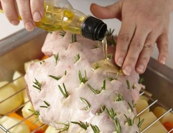3- ضعي قطعة الخروف فوق الخضر، سواء فوقها مباشرةً أو على رفّ حديدي، واسكبي ما تبقى من زيت الزيتون عليها وافركيها لكي تتغلغل في الجلد.