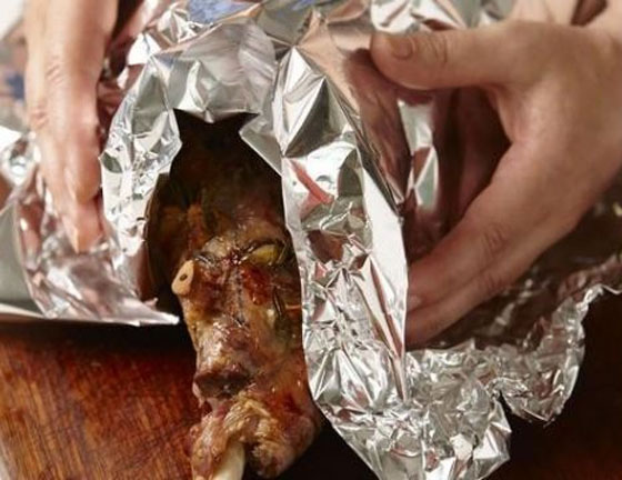 5- أخرجي الخروف من الفرن وارفعيه من القدر وغلّفيه بورق "الألومينيوم"، ثم دعيه يرتاح لـ20 دقيقة.