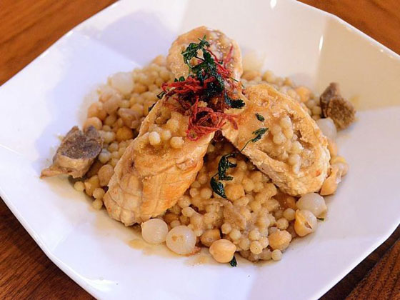 6- توضع الزبدة في طنجرة وتضاف إليها المغربية وتقلّب جيداً لتنشف، ثم ينثر الملح والبهار والكراوية، ويسكب قسم من مرق اللحم والدجاج ومرق البصل، ونصف كميّة الحمص المسلوق، وتترك على نار هادئة مغطّاة لمدة 8 دقائق.بعدها، تحّرك من الأسفل إلى الأعلى، وتدع لمدّة 4 دقائق.وتقدّم مع اللحم والدجاج والصلصة.