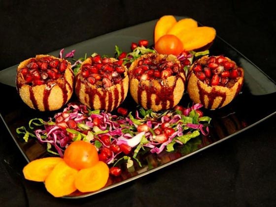 6- بعد نضجها، تصفّ في طبق التقديم، ويوزّع فوقها حب الرمان، ويسكب دبس الرمان، ويزيّن هذا الطبق حسب الرغبة.