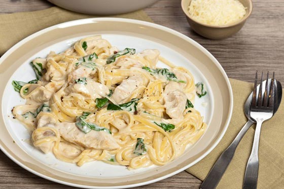 - الآن ضعي المعكرونة المسلوقة في إناء التقديم ثم غلفيها بالصلصة المحضرة وقلبي المكونات جيداً حتى يتكون لديك طبق المعكرونة اللذيذة بصلصة السبانخ والجوز البرازيلية وقطع الدجاج.