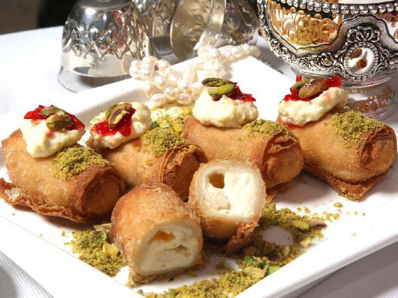 3 ـ عند الفراغ من لف هذه الكميّة، تُقلى في زيت ساخن جدّاً حتّى تكتسب اللون الذهبيّ، ثمّ تُصفّى جيّداً ، وتزين بالقشطة والفستق وزهر الليمون.