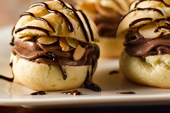 - تقطع كل قطعة بروفيترول إلى نصفين كما بالصورة وتدهن نصف كمية البروفيترول بشوكولاتة النوتيلا ثم المكسرات ثم يوضع على الشوكولاتة النصف الآخر من قطع البروفيترول.