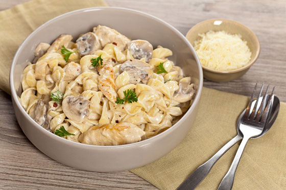 - ضعي المكرونة المسلوقة فى طبق التقديم وفوقها الدجاج المشوح والفطر والصلصة البيضاء وباقي كمية الجبنة الموزاريلا ويقدم.