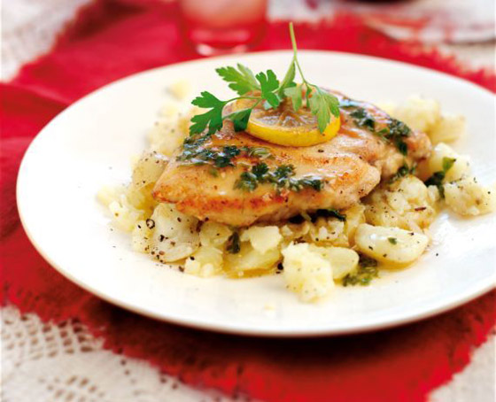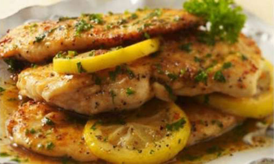 5. أسكبي كلاً من مرق الدجاج، وعصير الليمون الحامض، إلى المقلاة التي سبق أن طهوت الدجاج فيها (بدون تنظيفها حتى تختلط عصائر الدجاج بالمرق وعصير الليمون). واغلي هذه السوائل لمدة دقيقة، مع إضافة الكمّ الباقي من الزبدة، والبقدونس. ثم، وزعي هذا الخليط فوق صدور الدجاج الساخنة، وزيني الطبق بشرائح الليمون، وقدّميه مع البطاطسالمهروسةمعزيتالزيتون، والجزر المقليفيالزبدةمعالشبت.