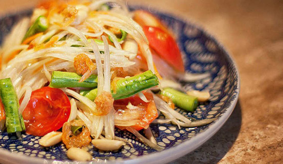 طبق "سوم توم يوت ما براو" والمحضر من البندورة، والفاصوليا الخضراء، ومكسرات الفول السوداني، وعصير الليمون، وسكر النخيل، وصلصة السمك والفلفل الحار.