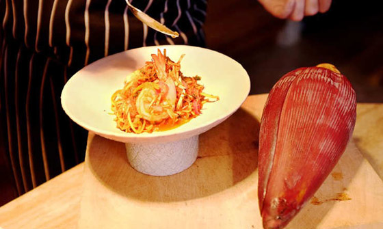 سلطة "زهر الموز: وتُحضر من "عشبة الليمون" وصلصة أو معجون الفلفل الحار المشوي، والكراث، والقريدس، وعصير الليمون.