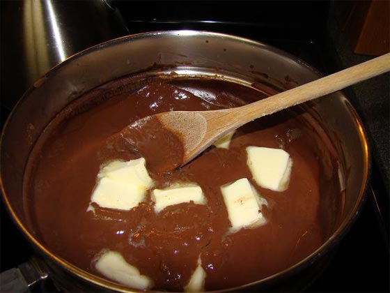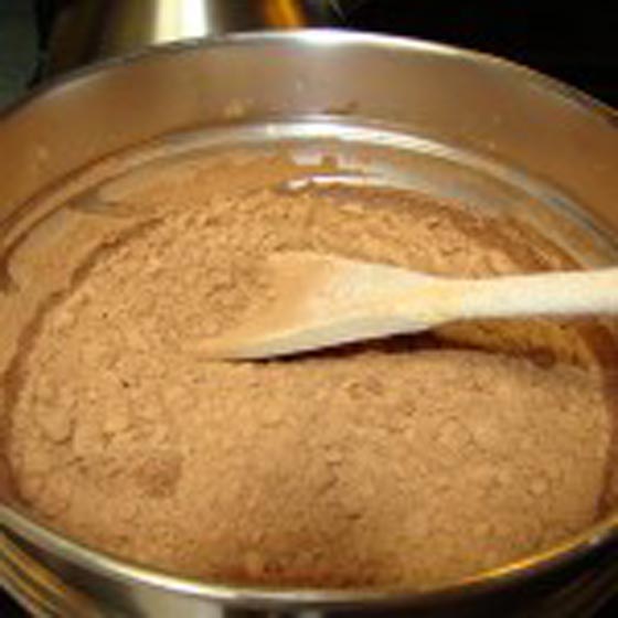 إضافة السمن و التقليب حتي تذوب جيداً . خفق الدقيق و السكر و مسحوق الخبز و صودا الخبز إلي خليط الكاكاو حتي يصبح الخليط ناعم جداً .