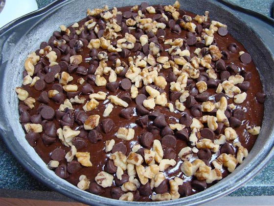و توزيع الخليط في المقلاة و رش رقائق البندق و الشيكولاتة .