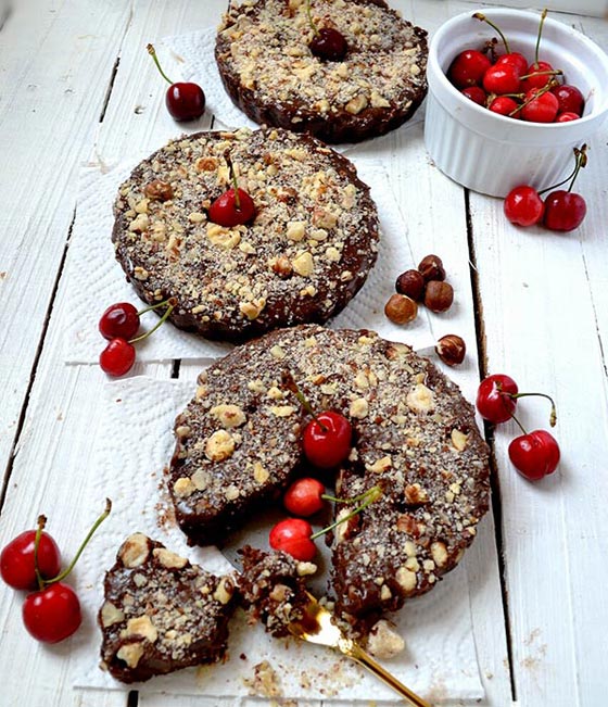 4. اسكبي خليط الكريما على البندق فوق الكيك وزيني بالبندق والكرز واتركيها لتبرد في الثلاجة ثم قدميها.