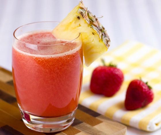 1. في إبريق الخلاط ضعي الفراولة،الأناناس السكر شغلي لتحصلي على خليط من العصير ناعم.