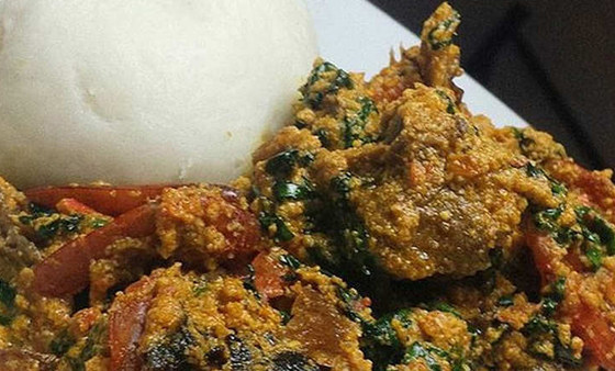 طبق "باونديد يام وإيغوسي" النيجيري، ويتكون بشكل أساسي من نبيذ النخيل وبذور البطيخ