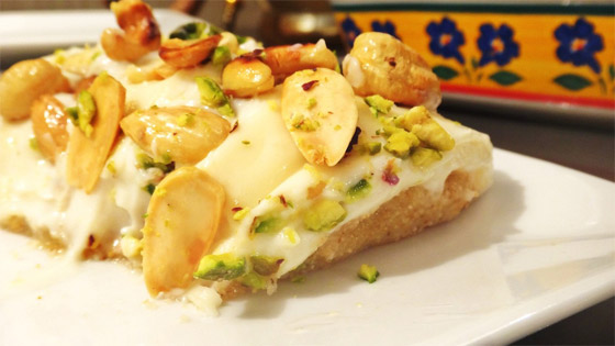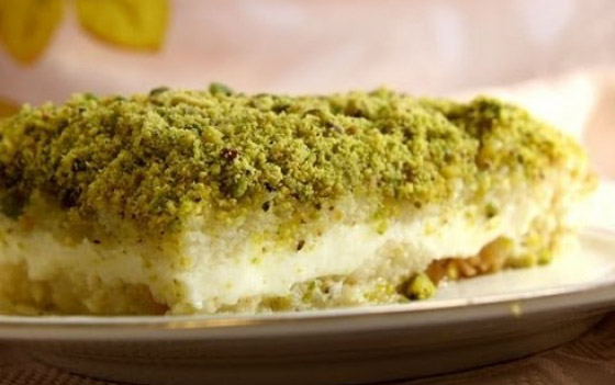 7. ندهن القشطة على الوجه ثم نزين بالفستق والكاجو وتقدم دافئة أو باردة حسب الرغبة.