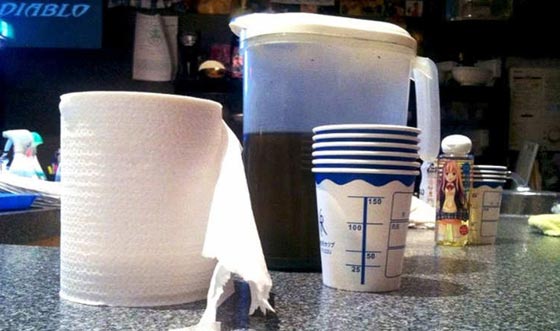 ولضمان تجربة متكاملة، اختار المطعم أكسسوارات تتماشى مع الفكرة العامة للمطعم، مثل اختيار الأكواب الورقية التي تشبه الأكواب المخصصة للتبول، واستبدال مناديل الطاولة بورق المرحاض.
