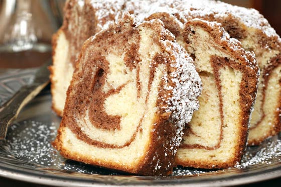 - يدهن قالب الكيك بالزبدة ويبطن بالدقيق، ثم يضاف نصف خليط الكيك الأبيض، ثم يوضع خليط الكيك بالكاكاو يليه باقي الخليط الابيض.