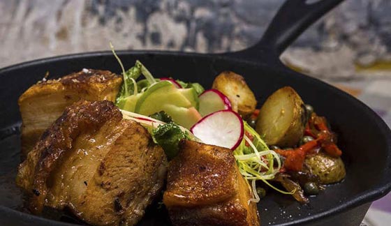 طبق اللحم مع صلصة الخل البلسمي والبطاطا المزروعة محلياً.