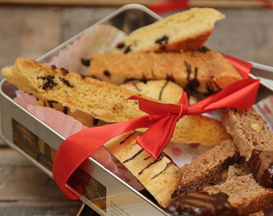 8. يُقطع كل جزء إلى شرائح بواسطة سكين الخاص بالخبز وترص في الصينية ويُعاد خبزها لمدة 10 دقائق أخرى.