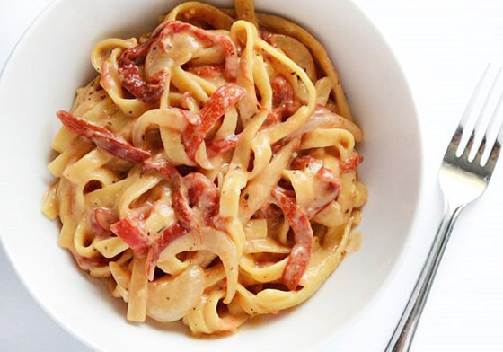 مكرونة مع السلامى: قومى بتحضير كوب من شرائح المكرونة " الفوتتشينى " ويضاف إليها قطع من " السلامي أو التونة" يمكنك رش الملح أو الفلفل الأسود على الخليط وفى حالة وجود جهاز ميكروويف فى مكان العمل يسخن قبل الأكل.