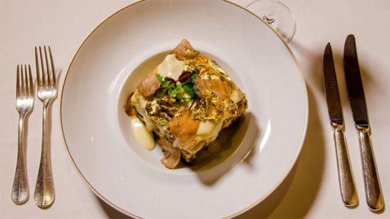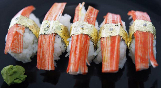 كذلك سوشي ملفوفة برقائق من الذهب ابتكرها الشيف أنجليتو آرانيتا والذي دخل بها موسوعة غينيس للأرقام القياسيّة باعتبارها أغلى قطع من السوشي حول العالم، إذ يبلغ سعر الحبة 1800 دولارًا أمريكيًّا. فيما جاءت لازانيا ماسية وذهبيّة مصنوعة مع رقائق من الذهب والماس يقدّمها أحد المطاعم في مدينة لاس فيغاس يبلغ سعر القطعة الواحدة منها 100 دولارًا أمريكيًّا. كذلك وجد برجر من الذهب واعتبر أنه أغلى برغر في العالم، يقدّمه أحد المطاعم في مدينة نيويورك، تحت اسم "Douche Burger" ويبلغ سعره 6 66دولارًا أمريكيًّا .
