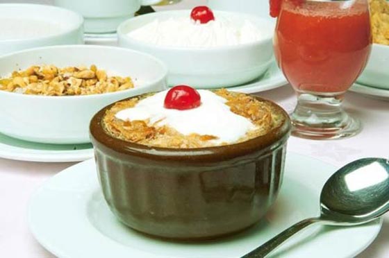 2. يغطّى وجه الوعاء بالكريما ورشة من السكر. ثم، يوضع الوعاء في صينية أكبر منه حجماً، مليئة بالماء، ويتمّ إدخالها إلى الفرن مع مراعاة تشغيل الشواية فقط، علماً أنه من المفترض أن نحصل على وجه أحمر للطبق، وليس أن يطهى لينضج بصورة كاملة.