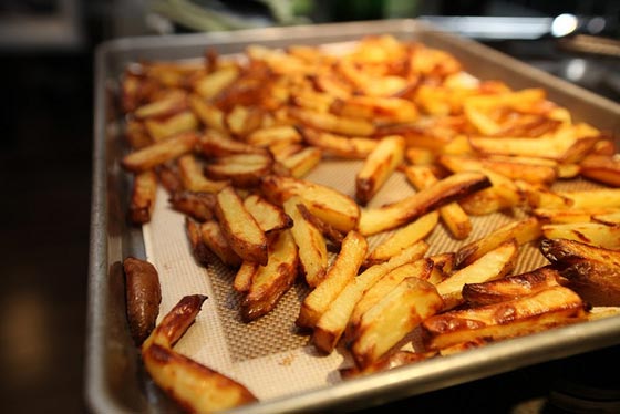 نحتاج صينية واسعة للخبيز، ويتم وضع ورق الخبيز الخاص او الورق الفضي ( الألومنيوم) في قعرها. تصف البطاطس في الصينية طبقة واحدة وتوضع في فرن ساخن ( حوالي 220 - 200 درجة مئوية) لمدة 30 - 40 دقيقة ثم تقلب البطاطس وتعاد الصينية الى الفرن حتى يصبح لون البطاطس ذهبيا. تقدم ساخنة مع الكاتشب.