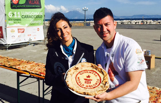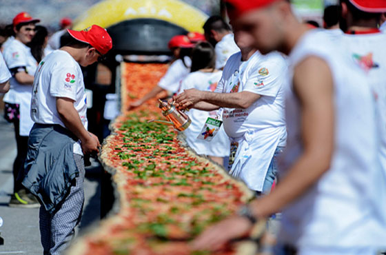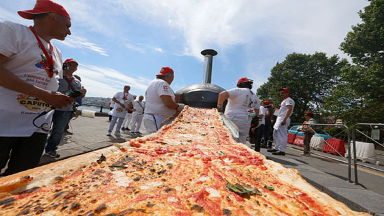 صنعت أطول بيتزا في العالم قبل أيام في إيطاليا بنابولي، وبلغ طولها 1.8 كيلو متر، وعمل على تجهيزها 250 شخصا من صناع البيتزا، واحتاجوا إلى ست ساعات عمل و 11 دقيقة. ودخل في تكوينها 2000 كيلو غرام من الطحين، 2000 كيلو غرام من جبنة الموزاريلا، و 1600 كيلو من البندورة، 200 لتر من الزيت، و 30 كيلو من الريحان. وبهذا دخلت هذه البيتزا في موسوعة غينيس للأرقام القياسية.