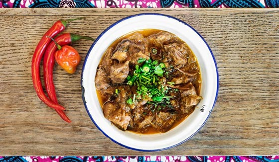بتقديم الأطباق الغانية التقليدية، منها طبق كاري الماعز هذا، في حاوية شحن في جنوب لندن.