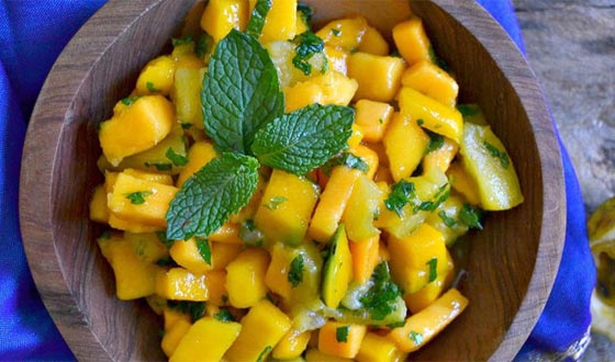 التقاط صور شهية لأطباقها، مثل صورة سلطة المانغا والنعناع هذه.