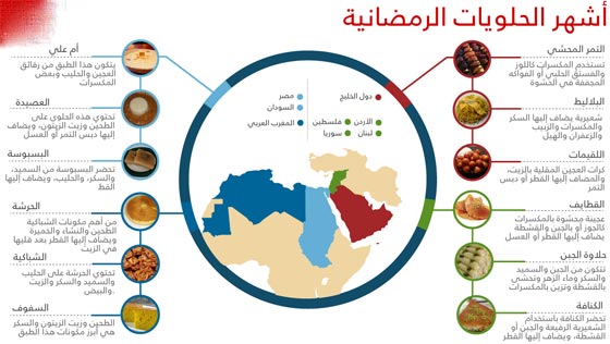رمضان شهر للتعبد والصيام، وهو الشهر الذي تزين فيه مختلف المأكولات والأطباق الشعبية مائدات الطعام حول العالم، أما الحلويات فهي ثقافة منفردة تتميز فيها كل دولة في العالم الإسلامي.. شاهدوا أبرز الحلويات التي تشتهر بها الدول العربية. وتشتهر دول الخليج بالتمور المحشية واللقيمات والبلاليط، أم بلاد الشام فيكثر فيها القطايف والكنافة وحلاوة الجبن، أما المغرب العربي فيحوي الشباكية والحرشة والسفوف.