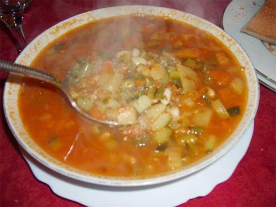 - تسخين زيت الزيتون في وعاء كبير علي نار متوسطة الحرارة وإضافة كل من البصل والثوم حتي يصبح البصل شفاف لمدة 3 دقائق تقليب البطاطس، الجزر، الكوسا، الطماطم، الفاصوليا الخضراء وإضافة القليل من الملح والتقليب لمدة 3-4 دقائق ثم تضيف الزعتر وهنا يمكن إضافة صالصة الطماطم حسب الرغبة. مع تقليل درجة الحرارة وتركه علي نار خفيفة لمدة 15 دقيقة علي الأقل .