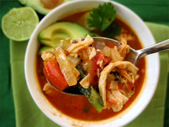- ضيفي عصير الليمون إلي الحساء والتوابل الملح والفلفل وتزيين الحساء بالدجاج والتورتيلا والأفوكادو .
