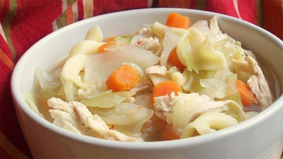 9. حساء الملفوف الحار بالدجاج: شوربة الملفوف لذيذة ومغذية ويتم فيها استعمال صدور دجاج بعد نزع الجلد والدهن عنها حتى تكون صحية وغير ثقيلة على المعدة. ويمكن حسب الرغبة اعداد الشوربة بدون دجاج لتكون نباتية.