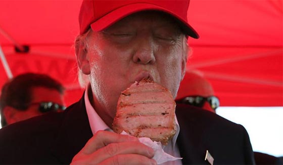 المرشح الجمهوري للرئاسة دونالد ترامب يتناول قطعة من لحم الخنزير في ولاية آيوا الأمريكية في العام 2015.