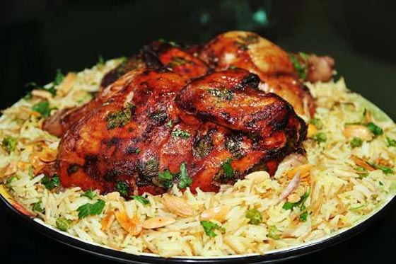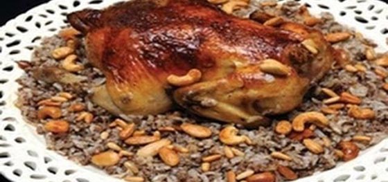 6. عند التقديم نضع الأرز المخلوط مع اللحمة والدجاج المشوي وفوقهم اللحمة المفرومة المتبقية والمكسرات والبقدونس المفروم.