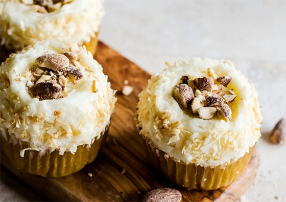 رصي الكب كيك في صينية مستديرة للتقديم ثم ضعي الكريمة في كيس حلواني وغطي قوالب الكب كيك بالكريمة، ورشة جوز هند مبشور وعلى الوجه حبات من اللوز المحمص المجروش، وبالهنا والشفا.