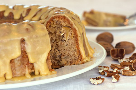 5. اخلطي السكر البني والزبدة والكريمة في قدر، وسخنيه على النار حتى يذوب السكر، واتركيه ليصبح دافئا ثم صبي الخليط على الكيك وهو دافئ وقدميه.