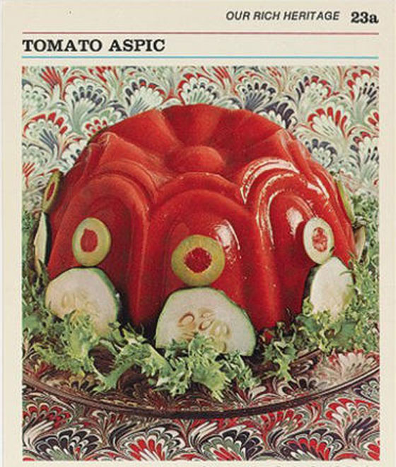 طبق هلام (جيلو) الطماطم، الذي رغم شهرته في القرن الماضي، إلا أنه لم يعد له أي وجود حالياً. وتظهر داخل الهلام قطع من الخضار واللحم
