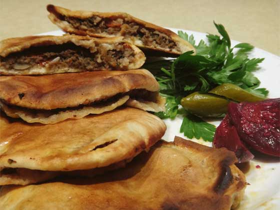 4. يوزّع خليط اللحمة على الوجه الأبيض للأرغفة ثم تغطّى بالطبقة الأخرى منها.