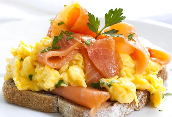 يعتقد الكثيرون ان سمك السلمون هو وجبة خاصة بالغذاء او العشاء فقط، ولكن الأجانب يقدمون السلمون المدخّن ضمن وجبة الفطور أيضا بإضافة بيض مخفوق مع حليب وبهارات وخبز التوست المحمص. ويعتبرونه وجبة فطور غنية شهية ولذيذة كلها فائدة وصحة.. اليكم وصفة طبق البيض المخفوق مع السلمون المدخّن.. وتمتعوا بأطيب الأكلات وأحلى الأوقات.