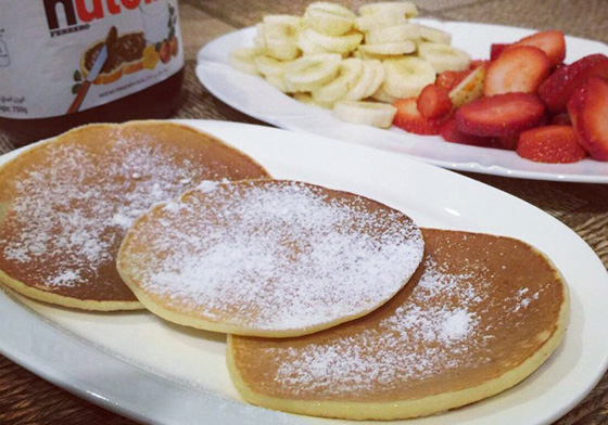6. تقدم البانكيك إلى جانب الشوكولاتة أو المربى أو السيرب أو أي نوع من الفاكهة ويرش فوقها القليل من السكر الناعم للتزيين.