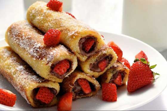- تُوزع قطع الفراولة على شرائح التوست ثم تُلف شرائح التوست بإحكام